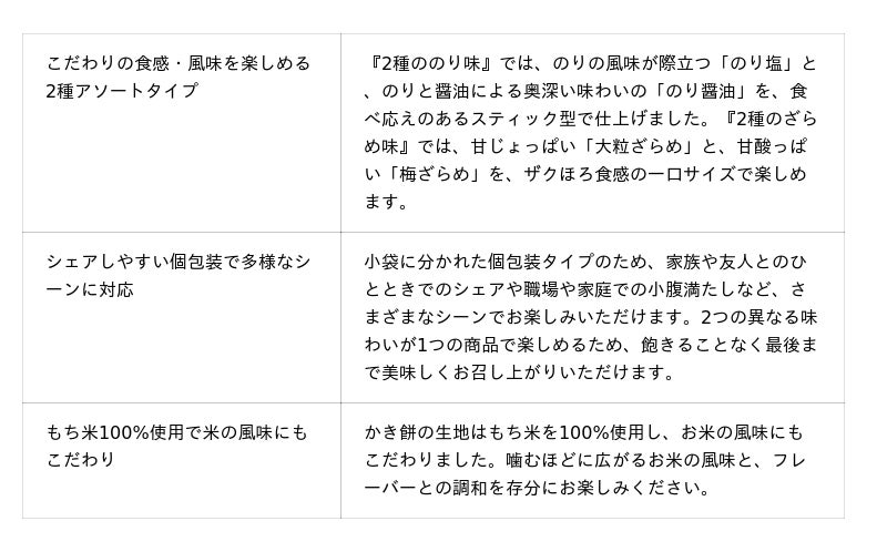 今回発売する「おかき餅」シリーズのこだわりは「食感」と「素材の風味」。当社が実施した調査※において、かき餅における購入時の重視点は、他ジャンルと比較して「食感」「食べ応え」が高く、かつ、かき餅ユーザーは豆、海苔、海老といった素材の入った商品を好む傾向があることが分かりました。