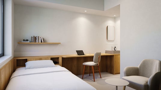 白を基調としたシンプルなデザイン。ベッドや冷蔵庫などの生活必需品を備え付け、コンパクトながらシャワー・トイレ別、独立洗面台付きで利便性の高い空間です。
