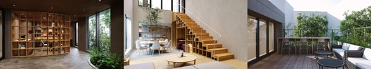 左から、エントランス、リビング・ダイニング、ルーフトップ