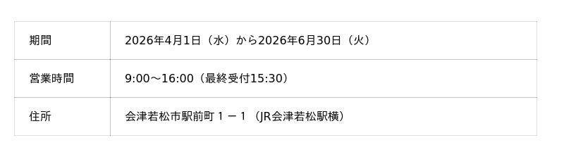 JR東日本東北総合サービス株式会社(本社:宮城県仙台市、代表取締役:弭間 俊則、以下「LiViT」)は、ふくしまデスティネーションキャンペーンが開催される2026年4月1日(水)から6月30日(火)までの3ヶ月間、JR会津若松駅前において「会津文化ゲートウェイ・ステーション」(実施主体:福島交通株式会社会津支社 運営:會舞道郷人)をオープンいたします。