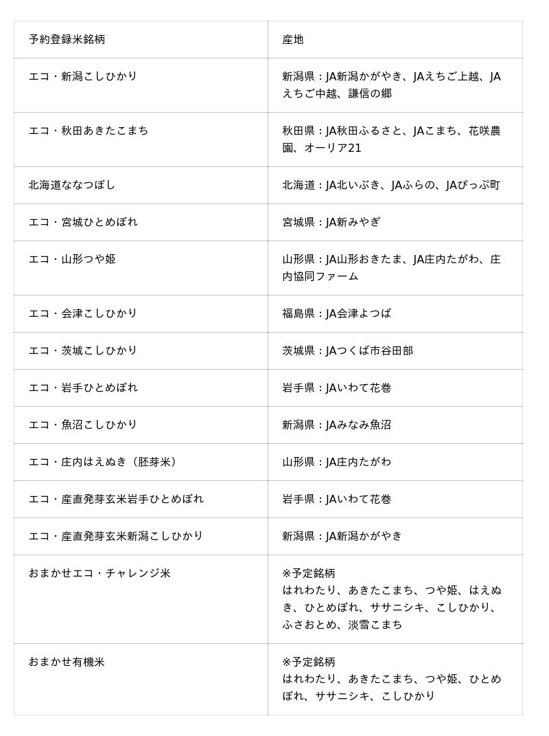 今年から、新たに2つの産地が予約登録米に加わりました。JAみなみ魚沼(新潟県)は『エコ・魚沼こしひかり』、JAいわて花巻(岩手県)は『エコ・岩手ひとめぼれ』の産地です。今年は以下の産地・銘柄から、好みの商品を選ぶことができます。