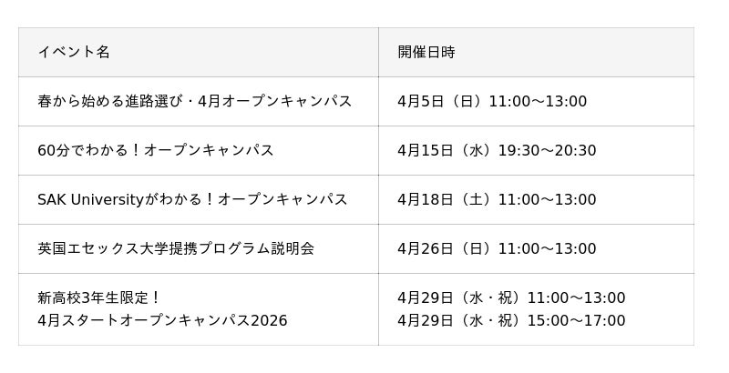 【SAK University】4月開催|新年度スタートダッシュ!オープンキャンパス・学校体験イベント