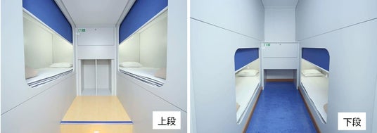 お一人様1ベッド。下段と上段が互い違いの入口になっているため、プライベート空間も確保