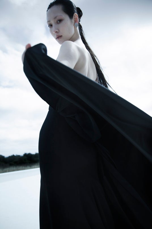 【ブランド初、意志を纏う「漆黒」】ブランド初となる、ブラック一色のマーメイドドレス。深い黒が静謐な「禅」の世界観を現代のモードへと昇華させた、今コレクションを象徴する一着です。