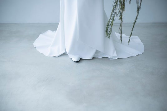 【凛とした知性と、しなやかな余韻】シャープな立ち姿の中に、背中から流れる柔らかなラインが共存。既成の花嫁像にとらわれず、自分自身の美意識を信じる女性にふさわしい、独創のシルエットです。