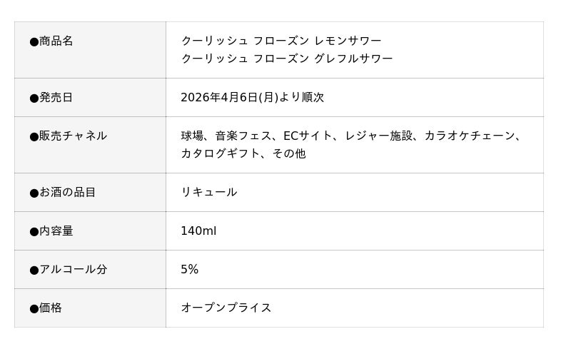 株式会社ロッテ(東京都新宿区、代表取締役社長執行役員:中島英樹、以下 ロッテ)は2026年4月6日(月)より順次、“飲むアイス”の「クーリッシュ」ブランドから、アルコール分5%の本格的なお酒『クーリッシュ フローズン レモンサワー』『クーリッシュ フローズン グレフルサワー』を発売します。当商品はパウチ容器なので、さまざまなシーンでシャリシャリした新感覚の酔い心地をシームレスに楽しめます。2022年の登場以来、その冷涼感とお酒の味わいを両立した商品として多くのお客様から好評をいただいており、今年も継続してZOZOマリンスタジアム、 ROCK IN JAPAN FESTIVAL 2026 、ECサイト、カラオケチェーンなどで販売します。「クーリッシュ フローズンサワー」ならではのお酒の楽しみ方を訴求していきますので、どうぞご期待ください。