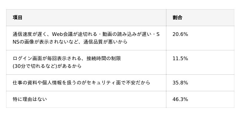 特に、通信速度や安定性といった通信品質に関する不満や、セキュリティ面への不安が挙げられており、外出先でのインターネット利用において、必ずしも快適・安心に利用できているとは言えない実態がうかがえます。