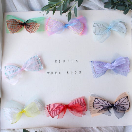オリジナルで刺繍したオーガンジーとチュールを組み合わせて作るリボンのワークショップです。最後にヘアピンかゴムを選んで仕上げます。