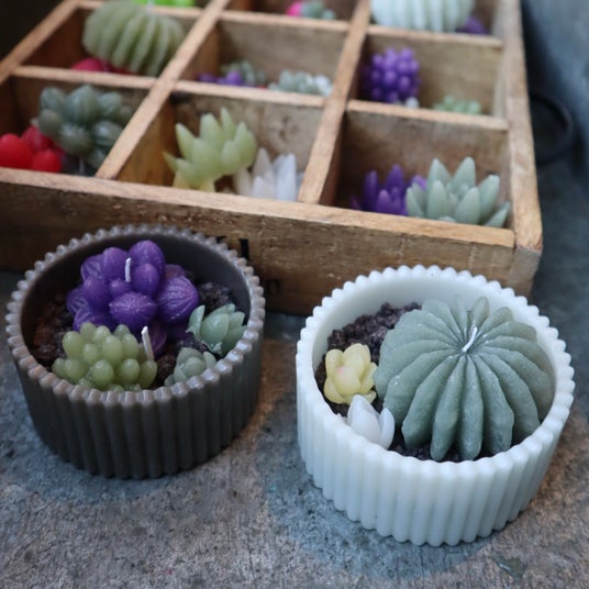 キャンドルの素材でできたカラフルな器と多肉植物のパーツを選んで、オリジナルのキャンドルを作るワークショップです。