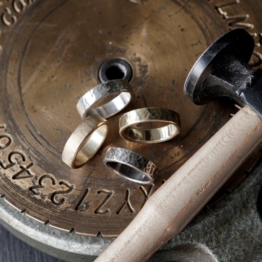 5mm幅の重厚な地金を使い、ガスバーナーとハンマーで仕上げる本格的な指輪作りのワークショップです。 シルバーは「燻し(いぶし)」加工でアンティークな風合いにも。真鍮は使うほどに深まる色味を。専門工具でのメッセージ刻印で、世界にひとつだけの特別な一点に。