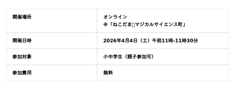オンラインイベントは、定員10組程度(親子参加可・無料)になりますが、後日「ねこだま🎩マジカルサイエンス町」*で、動画コンテンツなどを通じて体験することもできます。