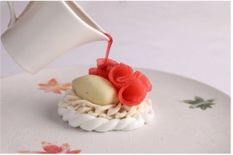 口の中でほどけるメレンゲに、⾚いベリーとりんごのやさしい⽢み、ほのかに生姜が香る柚子のソルベ、いちごのコンフィを重ねました。アールグレイが香るシャンティクリームが全体をまとめ、多彩な味わいが調和する華やかでエレガントな一品です。