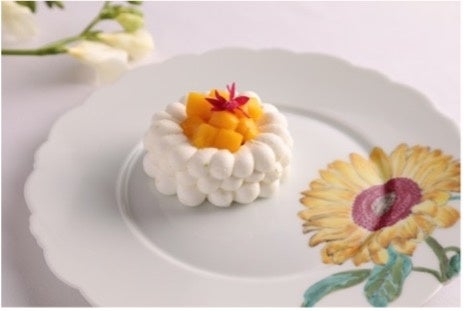繊細な口どけが魅力のデザート。外は繊細な⻭ざわり、中はやわらかく仕上げたメレンゲに、ライムをほのかに効かせたクリームを重ねました。マンゴーとパッションフルーツのコンフィが味わいに華やぎを添え、ライムでマリネしたマンゴーの果肉がみずみずしいアクセントに。爽やかさとトロピカルな余韻が広がる一品です。