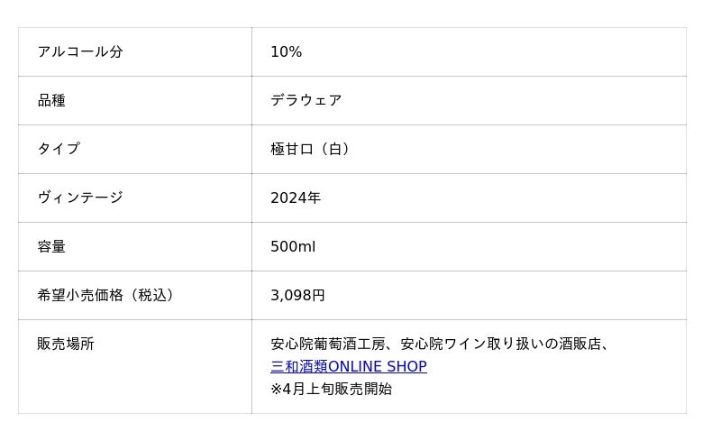 宇佐市安心院町産のデラウェアを100%使用。マイナス20℃で凍結させたデラウェアを、じっくり2日間かけて圧搾し、濃厚な果汁をステンレスタンクで低温発酵させたデザートワインです。