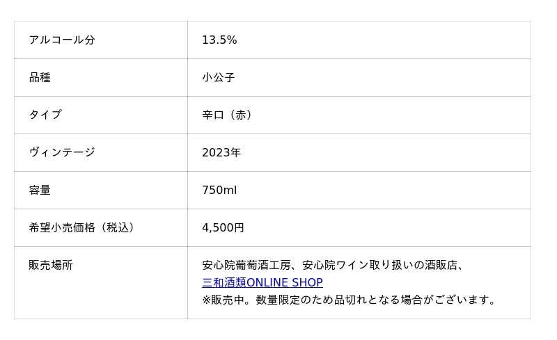 小公子は山ぶどうの交配品種で、小粒で強い色調、高い糖度と酸味が特徴のぶどう品種です。濃い赤紫色の色調にミントやスパイス、焼いた栗のようなスモーキーな香り、すっきりとした酸味と深い味わいのワインです。