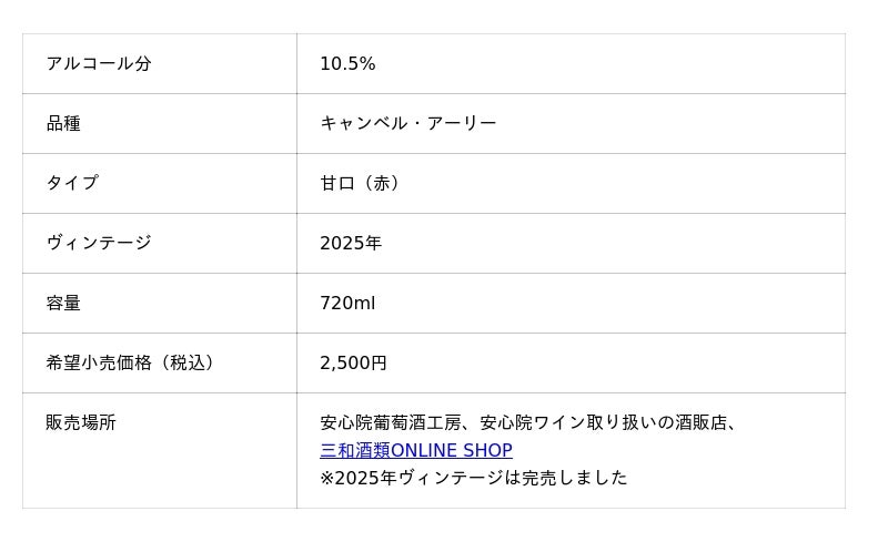 キャンベル・アーリー特有のぶどうを連想させる香り、ほんのりと甘い味わいが特徴で、まさしくぶどうを食べているかのような心地よさを与えてくれる赤ワインです。