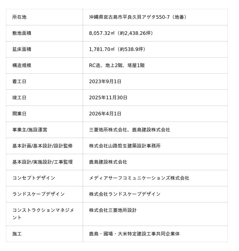 三菱地所と鹿島建設は、本計画地である宮古島市トゥリバー地区の開発に携わっており、2023年6月に1期ホテル計画として、ヒルトンが運営する「ヒルトン沖縄宮古島リゾート」を開業しました。続く「(仮称)宮古島トゥリバー地区2期ホテル計画」として、ヒルトン運営の「キャノピーbyヒルトン沖縄宮古島リゾート」のほか、三菱地所・鹿島建設が運営する“賑わい施設”として商業施設「Yard miyakojima」の開発を進め、2026年4月1日に両施設を同時開業します。