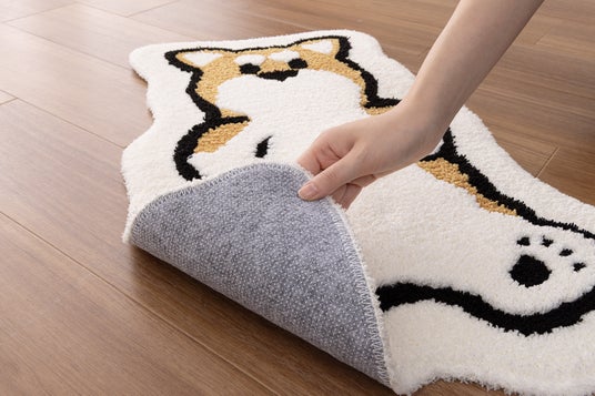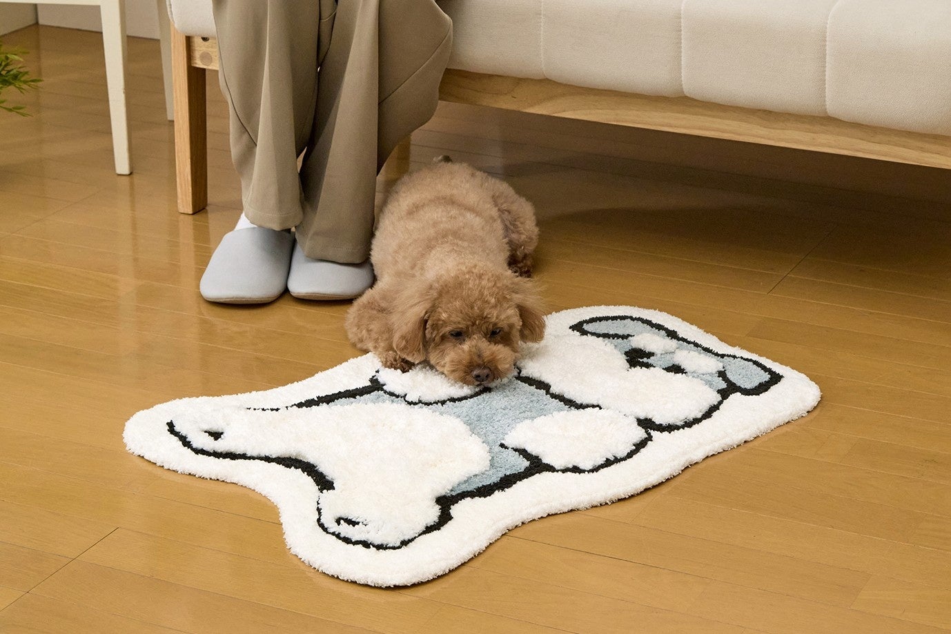リビングのソファ足元やベッドサイド、玄関に最適なサイズ設計にしました。裏面にはすべりにくい加工を施し、フローリングでも安全に使用ができます。インテリアとしてだけでなく、ワンちゃん自身の「お気に入りの場所」としても活用できる素材にしています。