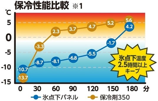 ※1 家庭用冷凍庫で24時間以上冷凍した保冷剤をクーラーボックスに入れ、40℃の環境下に放置し、保冷剤の表面温度を30分毎に測定した結果。