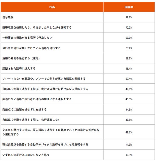 また、「信号無視」と「ながら運転」は、違反と知りながら行ったことがある行為としても多く、それぞれ85.0%、80.6%と上位を占めました【表5】。