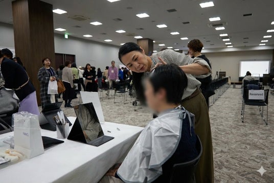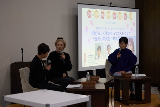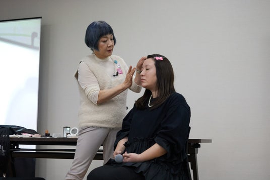 ステージでは、美容ジャーナリストの山崎多賀子さんによる「元気に見えるメイク」の実演が行われました。認定NPO法人マギーズ東京共同代表理事の鈴木美穂さんをモデルに、短時間で印象を明るく見せるメイクのポイントを紹介。山崎さんが実演しながらコツを解説すると、参加者は熱心にメモを取ったりうなずいたりしながら耳を傾け、日常生活でもすぐに取り入れられる実践的なテクニックに関心を寄せていました。