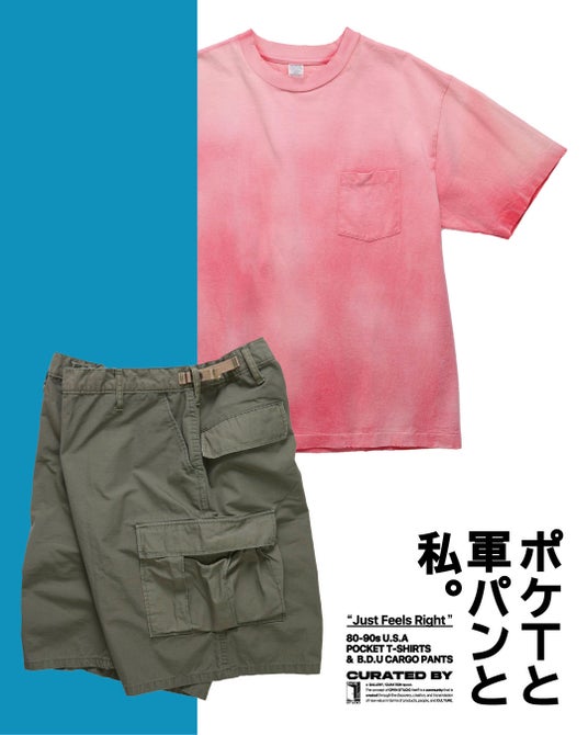 製品洗いのみのノーマルなポケTと、お気に入りの1枚をヘビーローテーションで着古したようなダメージ感と日焼け感を再現した特別な加工を施したポケTの2種類をご用意。
