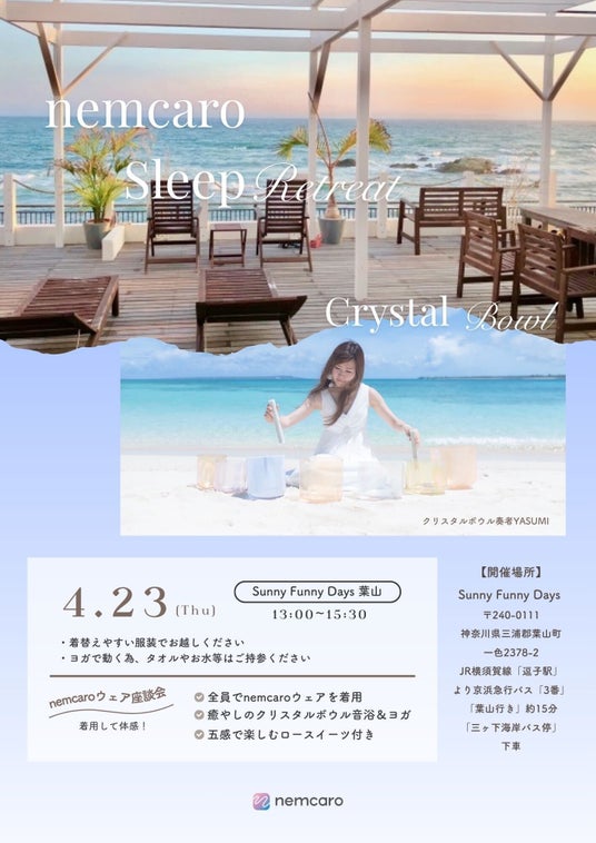 本イベントは、現在開発を進めているnemcaroスリープウェアの世界観を構築していく取り組みの一環として実施されるリアルイベントです。海辺の自然環境の中でヨガやクリスタルボウルによる“音浴”を体験しながら、心身の回復と深いリラクゼーションを促すプログラムとして開催されます。