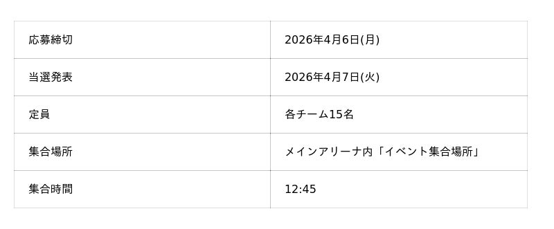 - 本企画は両クラブのファンの皆さまにお楽しみいただくためのイベントです。相手クラブへのリスペクトを持ってご参加ください。- 進行の都合上、時間が前後する場合がございます。