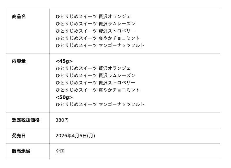 2025年に好評を博した「ひとりじめスイーツ 爽やかチョコミント」を再販するほか、夏の味覚として注目される塩やトロピカル素材を取り入れた新商品「ひとりじめスイーツ マンゴーナッツソルト」を発売いたします。