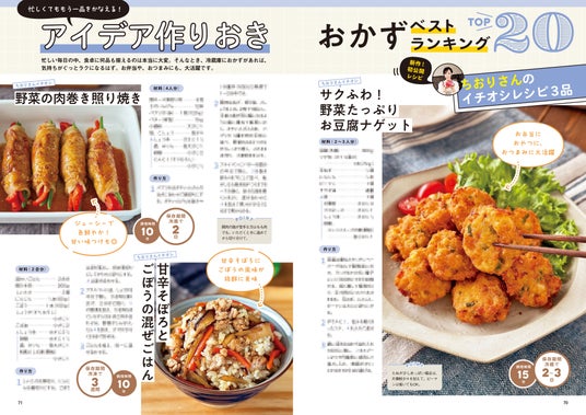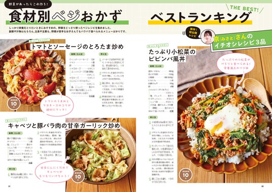 また、野菜があったら作りたい食材別のベジおかずなども充実。野菜をどっさり使ったレシピを集めました。野菜が苦手でもパクパク食べられるメニューばかりです。