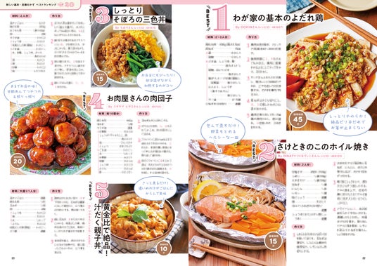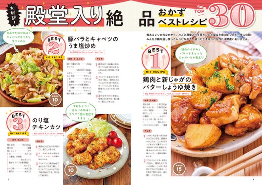 巻頭では、殿堂入りした主菜&主食30レシピを大公開! みんなが繰り返し作った人気レシピを厳選しているので、迷ったときにも頼れる、間違いなしのレシピが勢揃いしています。