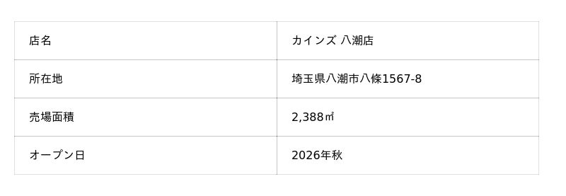 株式会社カインズ(本部:埼玉県本庄市、代表取締役社長 CEO:高家 正行)は、2026年秋、埼玉県八潮市に「カインズ 八潮(やしお)店」がオープンすることをお知らせします。同市への出店は今回が初めてです。