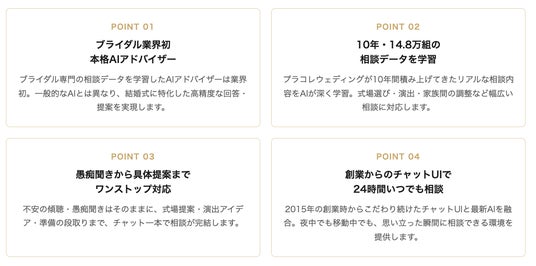 今回リリースする「AIアドバイザー」は、その膨大な相談データを基軸に、愚痴聞き機能はそのままに、実践的な結婚式相談まで対応できる「総合AIアドバイザー」として生まれ変わりました。ブライダル業界に特化したチャット相談データを学習したAIは業界初の取り組みです。