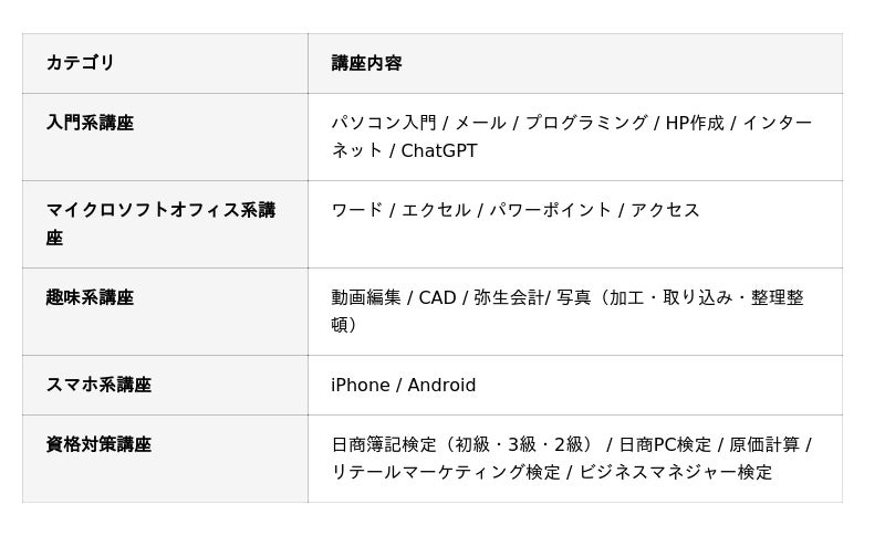 昨今の急速なIT化やリスキリング需要の高まりを受け、従来のWord・Excelなどの講座に加え、話題の生成AI「ChatGPT(チャットジーピーティー)」といった最新AI講座や、日商簿記検定・日商PC検定2級などの上位資格対策講座を新たに拡充します。