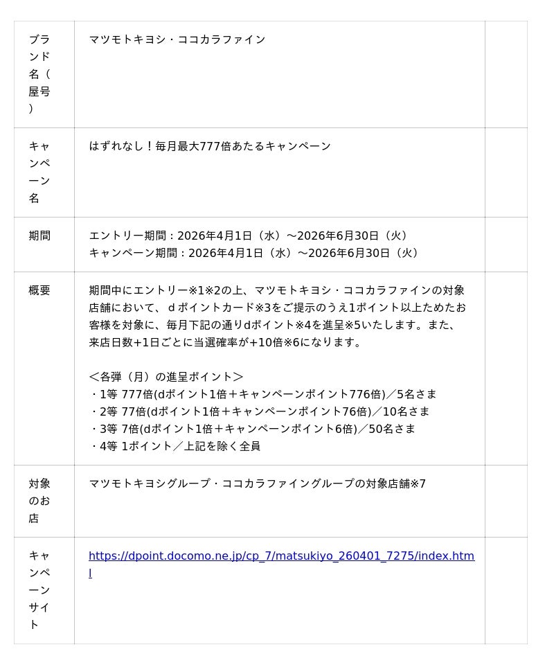 株式会社NTTドコモ(以下、ドコモ)は、マツモトキヨシグループ・ココカラファイングループにおいて、「はずれなし!毎月最大777倍あたるキャンペーン(以下、本キャンペーン)」を2026年4月1日(水)から2026年6月30日(火)まで開催いたします。
