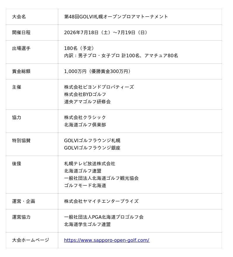 株式会社ビヨンドプロパティーズと株式会社クラシックは、北海道ゴルフ倶楽部ライオンコースにおいて、2026年7月18日(土)から19日(日)までの2日間、「第48回GOLVI札幌オープンプロアマトーナメント」を開催することを決定いたしました。