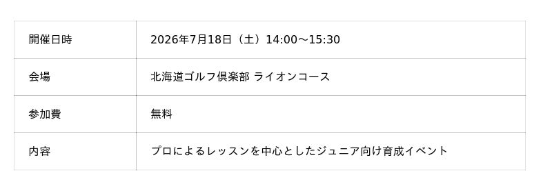 また、大会初日の2026年7月18日(土)14時から15時30分まで、同会場にてジュニア育成イベントを開催予定です。参加費は無料で、プロによるレッスンなどを実施いたします。