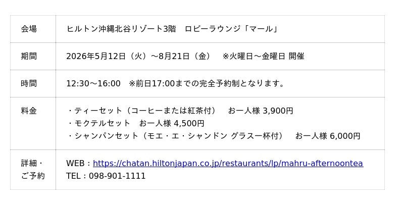 【2026年4月1日】ヒルトン沖縄北谷リゾート(北谷町(ちゃたんちょう)美浜(みはま) 統括総支配人 宍倉裕(ししくらゆたか))は、ロビーラウンジ「マール」にて、2026年5月12日(火)から8月21日(金)までの期間、火曜日から金曜日限定で『メロンづくしのアフタヌーンティー~ピーチが彩る初夏のひととき~』を提供いたします。選りすぐりの完熟メロンと芳醇な桃の魅力を引き立てたスイーツとセイボリーを堪能できる本フェアは、1日限定10名様でのご案内となります。