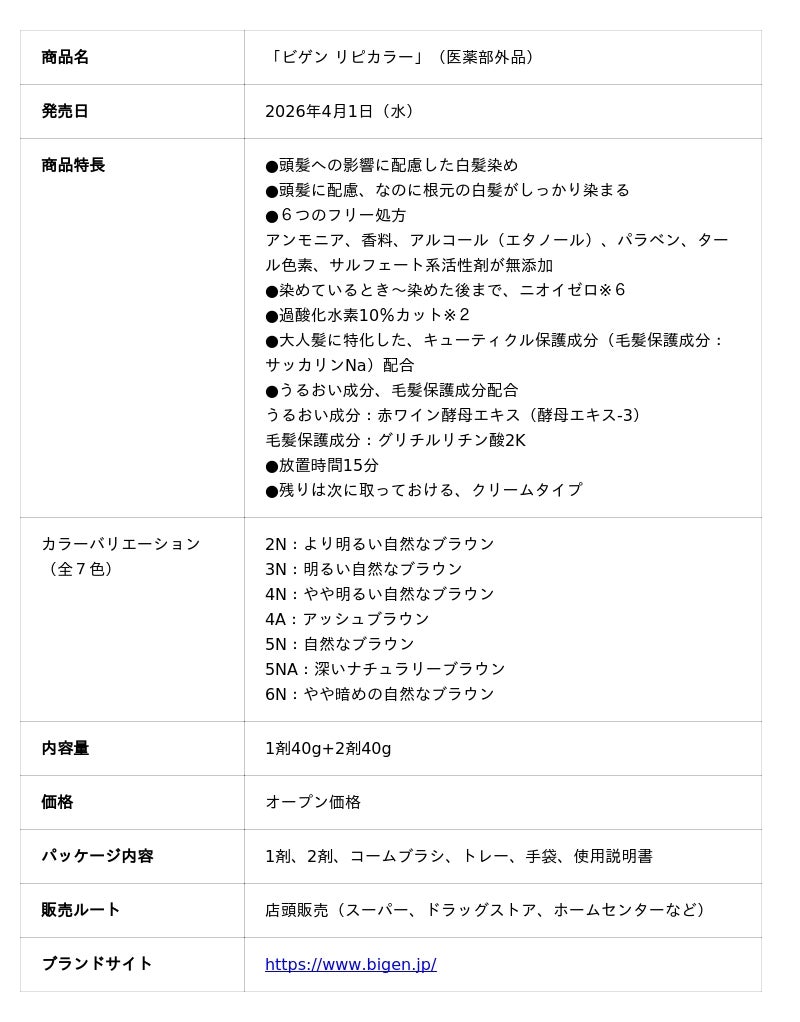 ホーユー株式会社(本社:愛知県名古屋市、代表取締役 社長執行役員:佐々木 義広、以下ホーユー)は、長年白髪用カラーリング市場を牽引してきたブランド「ビゲン」から、白髪が気になり「本当はこまめに染めたい」のに、髪の状態やニオイ、染まり、コストなど様々な“不安”から、染めるタイミングを先延ばしにしてしまうお客様の“ジレンマ”に着目し、その根本課題に応える白髪染め「ビゲン リピカラー」を、2026年4月1日(水)より発売いたします。