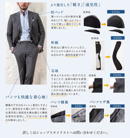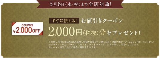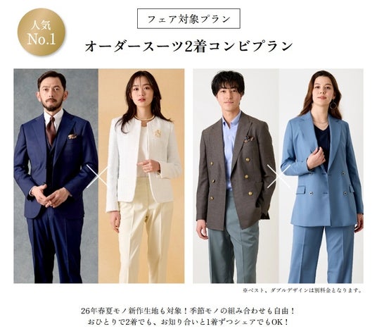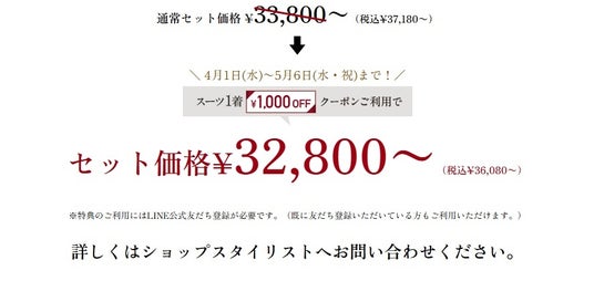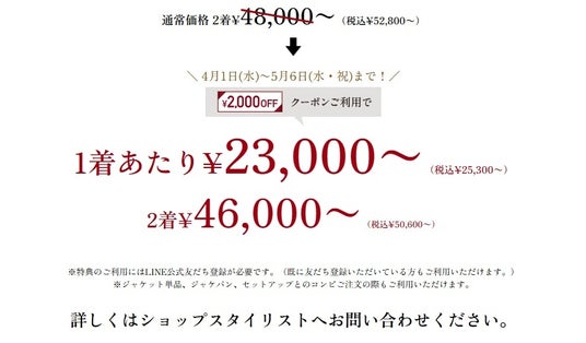 クーポンのご利用で本格オーダースーツが1着あたり23,000円~(税込25,300円~)ご購入いただけます。フェアは本日4月1日(水)から5月6日(水・祝)までの期間限定、全店舗対象です。