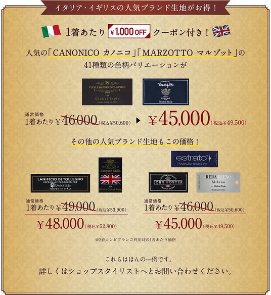 【今ならイタリア・イギリスの人気ブランド生地もお得!】