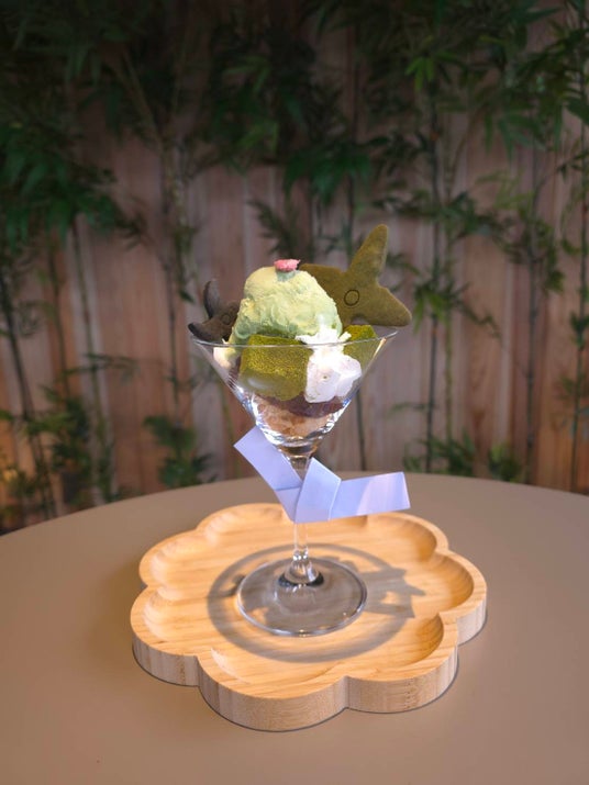 サクサクの手裏剣クッキーが目を引く、当カフェの看板メニュー。濃厚な抹茶アイスを筆頭に、わらび餅やあんこなど、京都ならではの和素材を贅沢に層にしました。