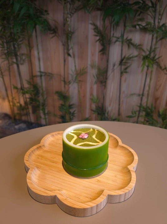 嵐山の象徴である「竹」を器に使用した、風情あふれる一品。マスカルポーネのクリーミーなコクと、抹茶のほろ苦さが絶妙にマッチします。表面には抹茶パウダーで手裏剣の模様を描き、忍者の「隠れる美学」を表現しました。