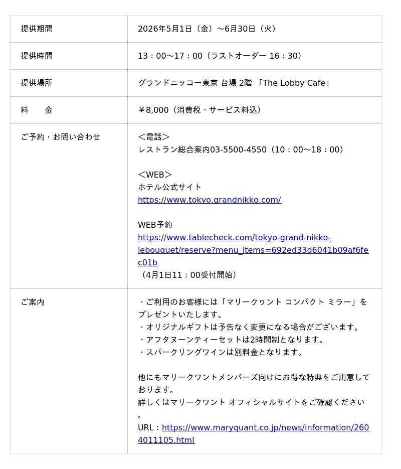 「東京を楽しむ 東京をくつろぐ」ひとときをお届けするグランドニッコー東京 台場(住所:東京都港区 総支配人:塚田 忠保)は、吹き抜けのロビーフロアに心地よい光が降り注ぐ「The Lobby Cafe」にて、コスメ・ファッションブランド、マリークワントの「MIZUIRO COLLECTION」から着想を得たコラボレーションアフタヌーンティー『MIZUIROティーパーティー』を2026年5月1日(金)~6月30日(火)の期間限定で提供いたします。