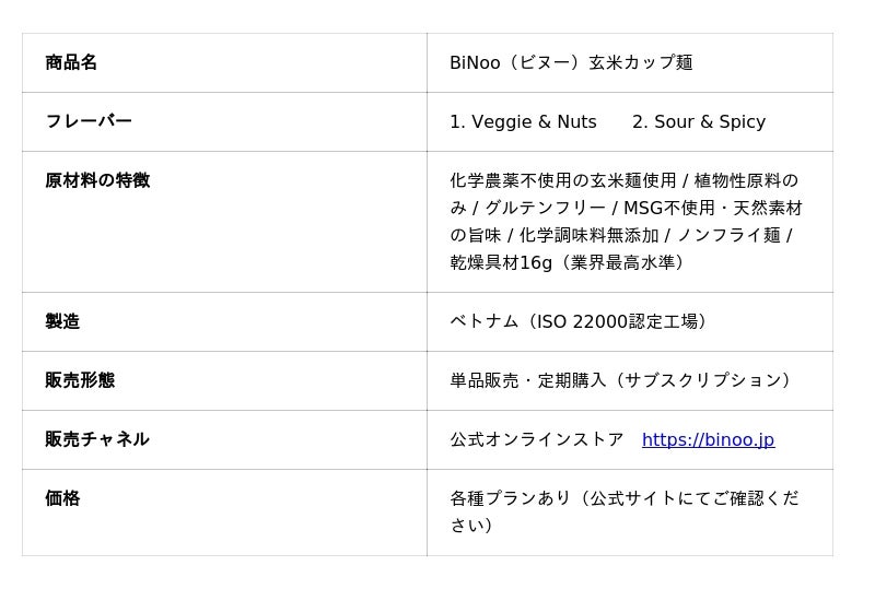 株式会社イノウエ企画(北海道札幌市、代表取締役:高嶌梓)は、植物性・グルテンフリーの玄米カップ麺「BiNoo(ビヌー)」の一般販売を正式に開始しました。クラウドファンディングにて336名のサポーターから支持を得た本商品を、サブスクリプション購入にも対応したオンラインストア(binoo.jp)にて販売します。