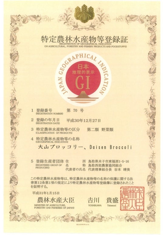 鳥取県西伯郡大山町及びその周辺の大山山麓(鳥取県西伯郡日吉津村・南部町・伯耆町、同県日野郡日南町・日野町・江府町、同県米子市)で生産されたブロッコリーが大山ブロッコリーとして、GI(地理的表示保護制度)登録されています。