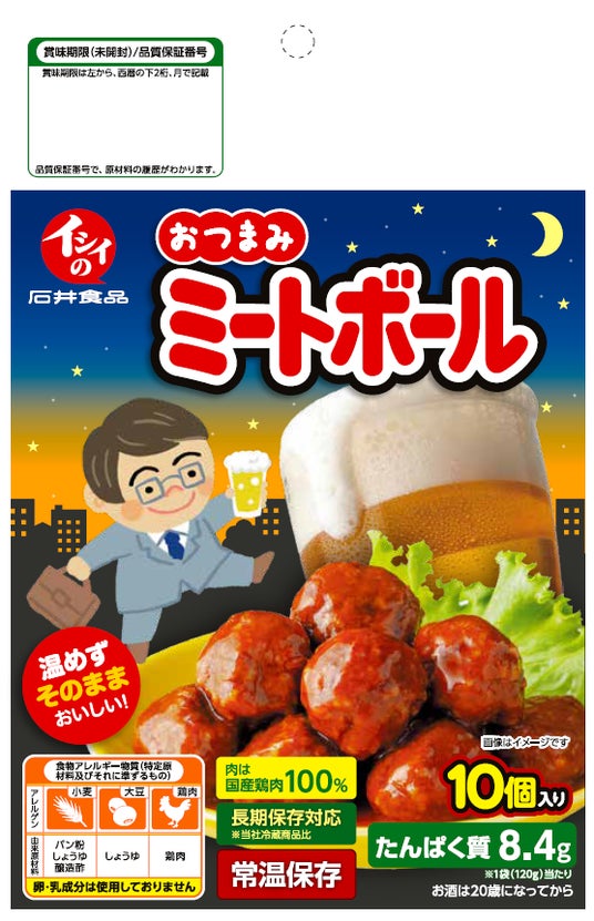 石井食品のミートボールは、「お弁当の主役」として日本の家庭に安心を届けてきました。『ライフスタイルフードカンパニーとして、お客様の生活シーンを支える存在』を目指す私たちが今回向き合ったのは、お弁当箱を飛び出したその先の「現代の夜の食卓」です。現在発売中の、常温で長期保存可能な「いつでもミートボール」は、日常から非常時まで幅広く活用いただける商品としてご好評をいただいています。今回はその品質と味わいはそのままに、働く親世代の日常に溶け込み、夜のひとときを支える専用パッケージの一品をラインアップに加えました。物価高騰で「家飲み」需要が高まる中、お弁当で培った信頼を夜の市場へつなげ、全世代・全時間帯の暮らしを支える存在を目指します。