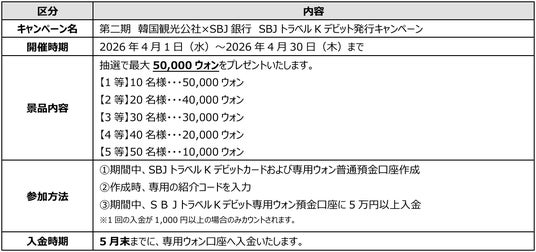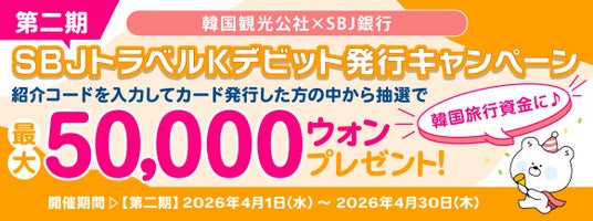 株式会社SBJ銀行(本店:東京都港区、代表取締役社長:並木 稔「以下、当行」)は、韓国観光公社と共同で実施しております「韓国観光公社×SBJ銀行 SBJトラベルKデビット発行キャンペーン」について、ご好評につき第二期キャンペーンを実施することをお知らせいたします。