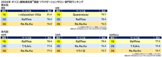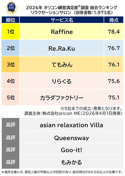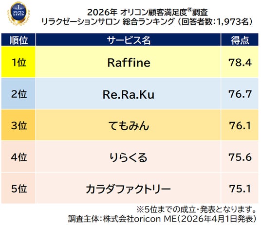 2026年 オリコン顧客満足度(R)調査 !初発表 ! 満足度の高い『リラクゼーションサロン』ランキング【Raffine】が総合1位(オリコン顧客満足度(R)調査)