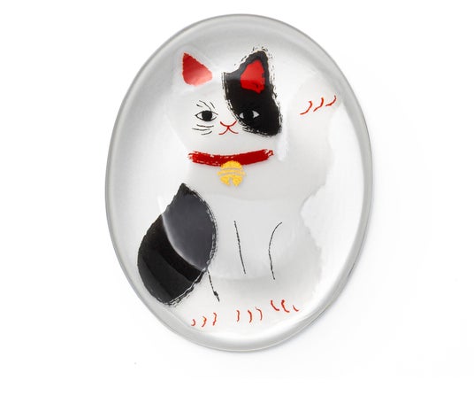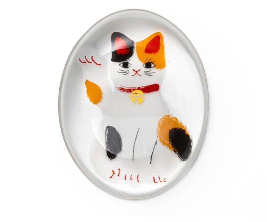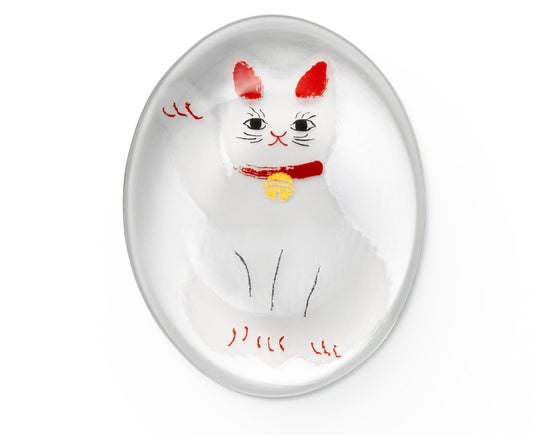 古来より、幸せを呼びこむ不思議な力があるとされる「縁起物」を、身近に楽しめるようガラス食器に写した「めでたmono」シリーズ。大切な方の幸せを願う贈り物として、また自分のラッキーアイテムとしてもお楽しみいただけます。中でも招き猫は、人や福を招く象徴として親しまれています。好評の“招き猫”柄豆皿に続く、第二弾として登場した箸置きです。やや大きめのサイズで安定感があり、日常使いでも扱いやすいのが特長。ガラスの厚みによって模様がふんわり揺らいで見え、角度によって猫の表情が異なって見えるのも魅力のひとつです。人気の猫種をモチーフにした全5柄を揃え、選ぶ楽しさも広がります。和紙風のモダンな化粧箱入りで、贈り物にも最適です。
